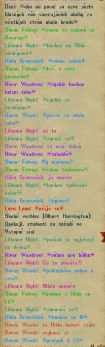Když se rány začaly ozývat z větší blízkosti, tušili jsme, že jde do tuhého. Přilítl někdo z profesorů, že máme jít s Raven a Riverem na ošetřovnu pomoct přemístit nějaké věci. Raven brblala, proč zrovna my, ale není to jasné? Jsme přece Odboj. Zachránili jsme Fénixe. A hlavně jsme očividně potřeba. Kdyby nešlo do tuhého, drželi by nás jako studenty dál. Tak jako doteď. Šli jsme podzemím, kde jsme narazili na další lidi. Trochu jsem se nejdřív lekla, ale byl tam Jay. Když jsem ho uviděla, úplně jsem zamrzla. Tak moc jsem ho chtěla obejmout... Ale měla jsem úkol a musela jsem jít.